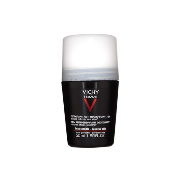VICHY HOMME Déodorant Anti-Transpirant 72h combat la transpiration excessive et les mauvaises odeurs.